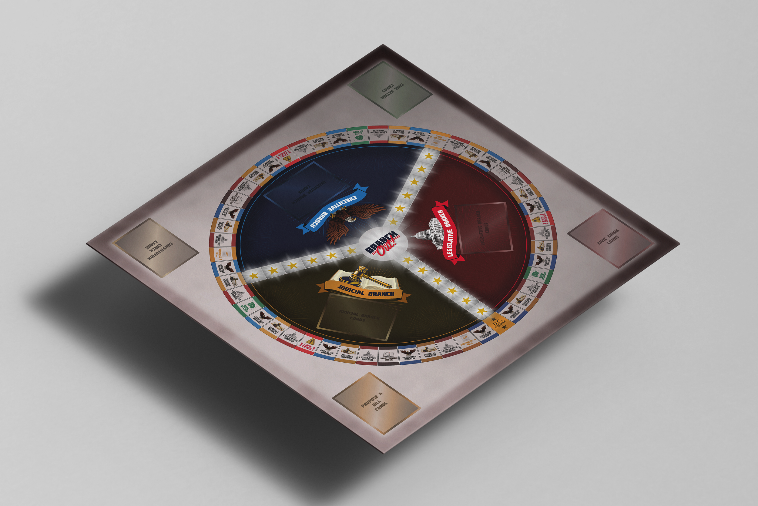Pictured from left to right: Legislative Branch Trivia Card, Civic Crisis Card, and Civic Action Card. While branch trivia cards — like Legislative Branch Trivia Cards — test players’ knowledge of the three branches of the United States government, Civic Crisis Cards allow players to act as members of the government to solve pressing issues ranging from national security to disaster response, rewarding or penalizing their “action” within a random draw. Civic Action Cards are dual-purpose cards. Similarly, Civic Action Cards reward or penalize players for civic actions on a random draw (i.e., “you attended a town hall meeting to learn about local issues, move forward 2 spaces!”), which encourages proper civic engagement actions/habits within voting, volunteerism, and more. Civic Action Cards also seek to inspire players to involve themselves civically within their local community by sharing potential engagement examples: Town Hall meetings, school board meetings, and more.